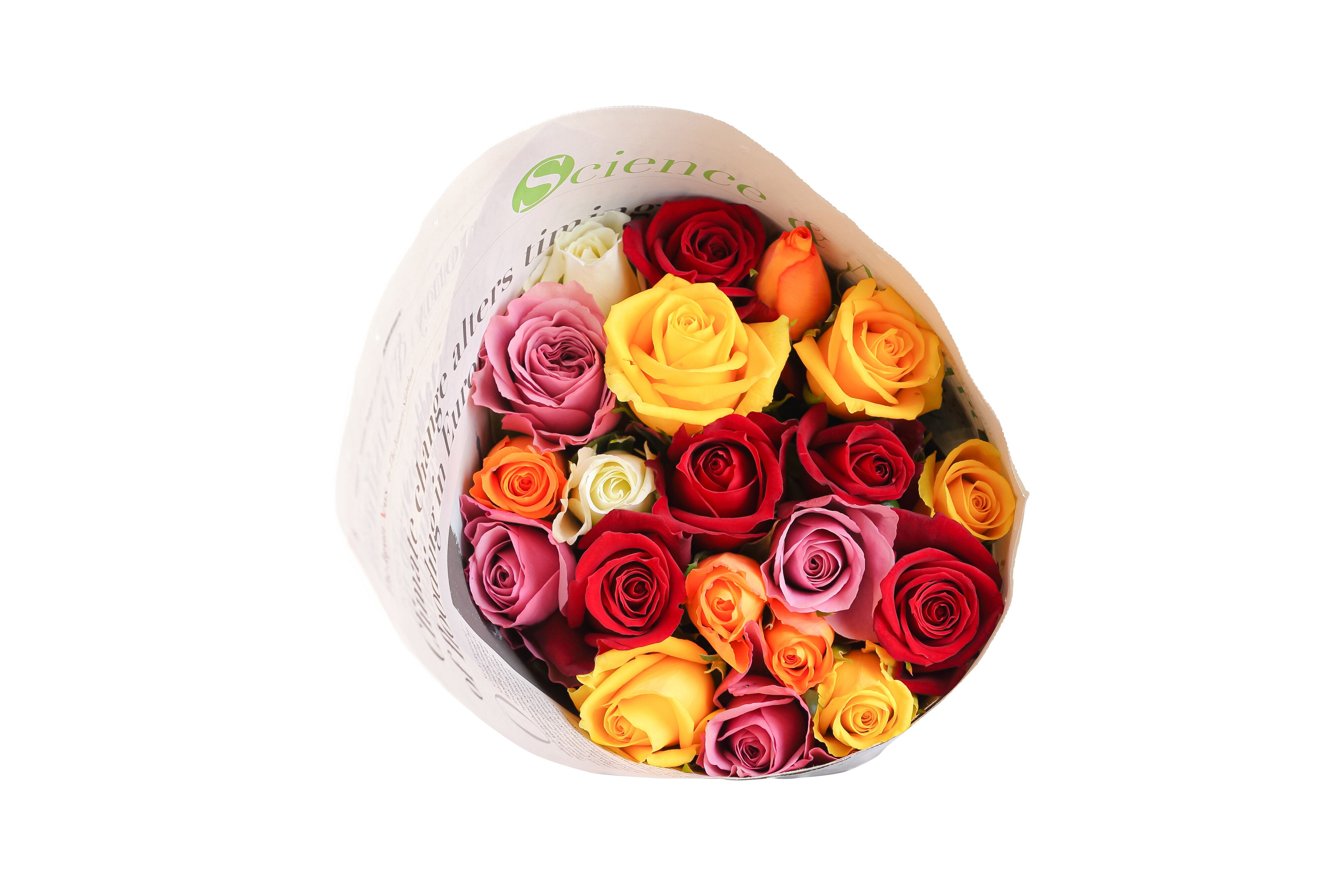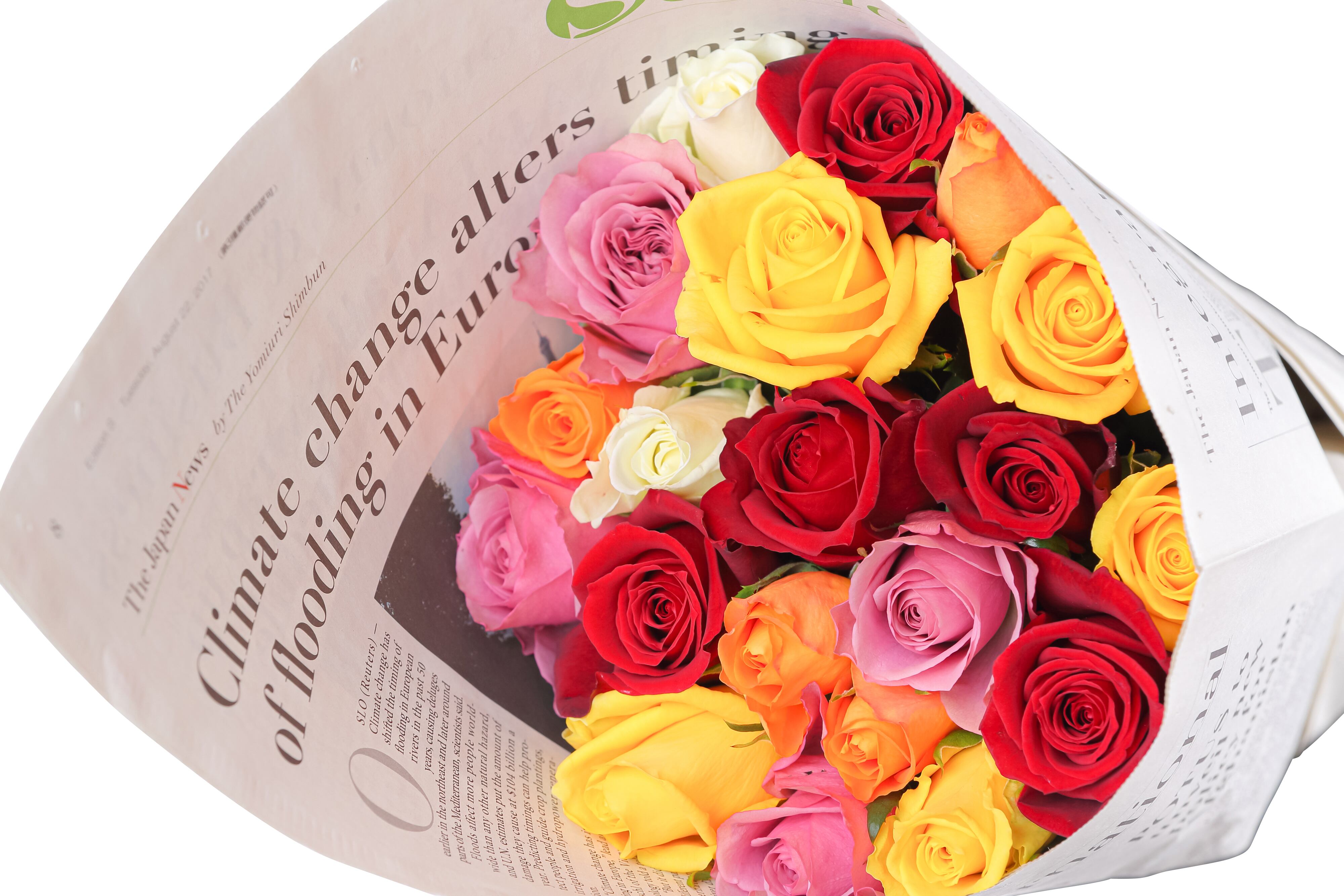 厳選した20本のバラを、英字新聞でラッピングし、専用箱にお入れして発送いたします。